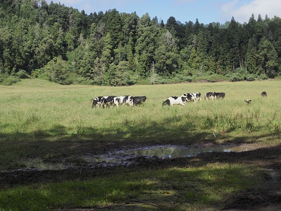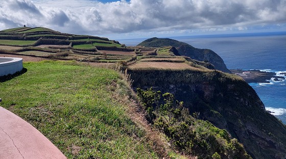 op het eerste uitzichtpunt, dat een eindje boven de oceaan ligt, zien we dat er toch wel heel wat landbouw is. Het gaat meestal om de productie van voer voor de vele koeien die het eiland rijk is. De koeien zijn melkkoeien voor de productie van melk en zuivel