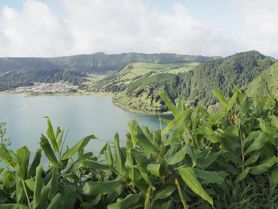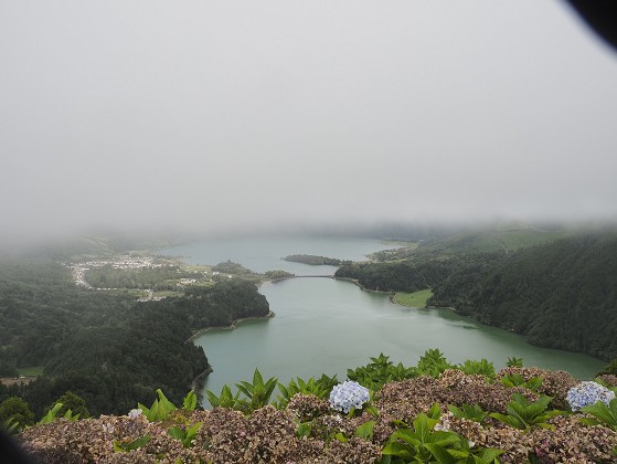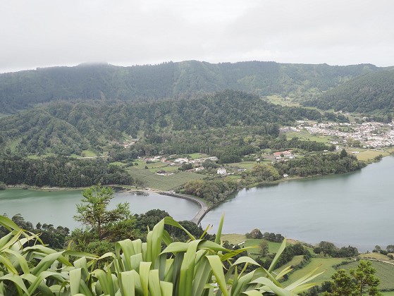 Later rijden we naar een eerste uitzichtpunt, niet zo bijster interessant. We zien het dorp Furnas en een kleine tip van het meer.