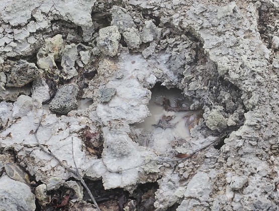 de bodem dichtbij de caldeiras is ruw gesteente, afzettingen van o.a. zwavel en micro-organismen zijn bedekken het gesteente