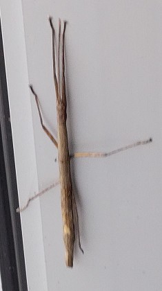 Op de deurstijl van het restaurant waar we dagelijks eten (net onder ons verblijf) heeft een grote wandelende tak (insect) post gevat