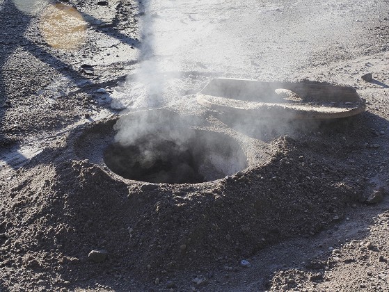 Naast de waterstoom en als gas koolzuurgas (CO2) komt er een kleine hoeveelheid H2S gas mee, dat de stank van rotte eieren veroorzaakt.