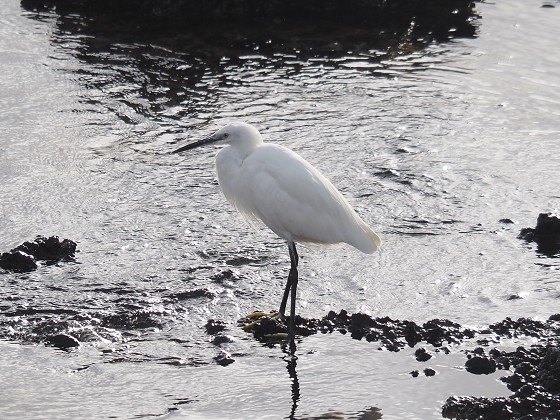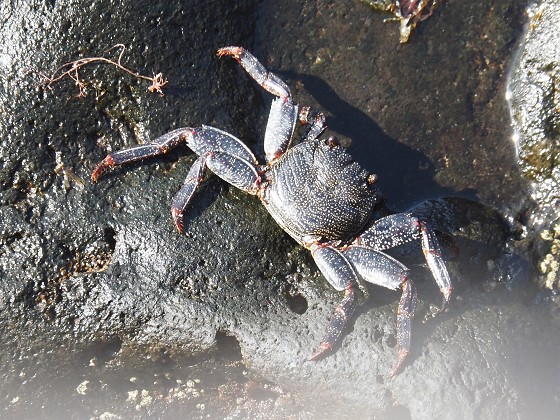 Hier en daar zien we een watervogel of zwarte krabben, die bijna niet opvallen tegen de zwarte lava.