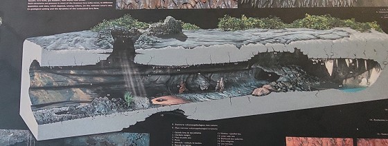 op een paneel zien we hoe de tunnel, de grot hier, gestructureerd is, de opening naar boven is nog goed zichtbaar