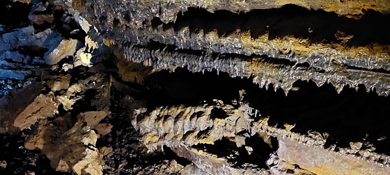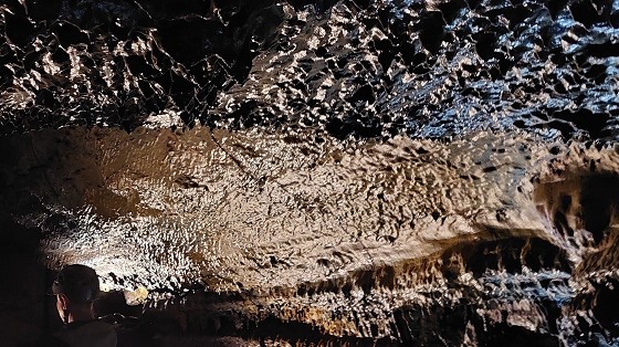de wanden van de tunnel zijn niet glad als buizen. Doordat er meermaals een stroom lava doorkwam, ziet men structuur in de wand, zoals legplanken in een kast