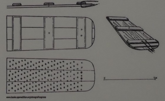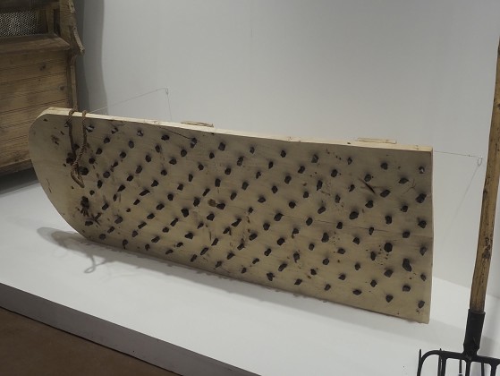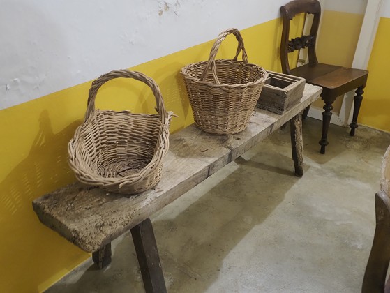 een bank waarop bij het begin van de winter het varken werd geslacht. Tijdens de koelere winter was het vlees langer bewaarbaar. Rechts op de bank 3 ineenzetbare bakjes. Dikwijls werd voedsel niet aangekocht (omdat er geen geld was) maar werd het geruild voor iets anders, of indien er niets was, werd er gewerkt (op het veld, genaaid, …)