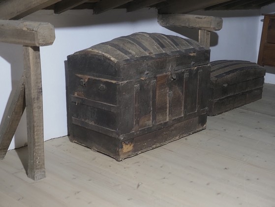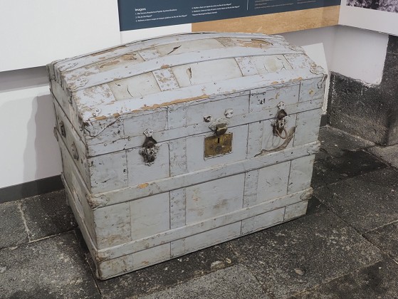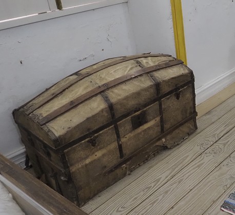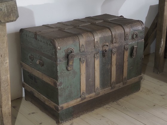 één van haar reiskoffers, uit hout en bekleed met kamelenhuid