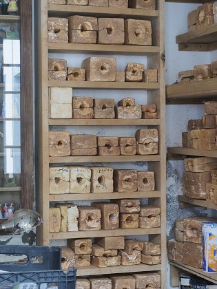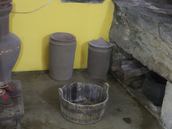stenen potten waarin het varkensvlees, overgoten met varkensvet en zout, een tijd in bewaard werd. Vooraan het klein model van de wastobbe, waarin mensen zich bij de stoof wasten