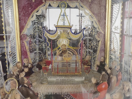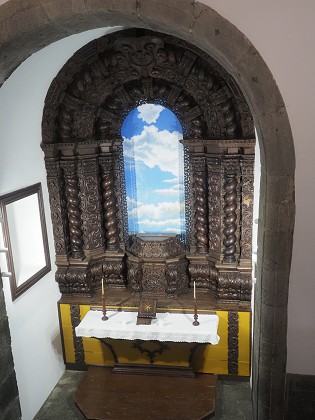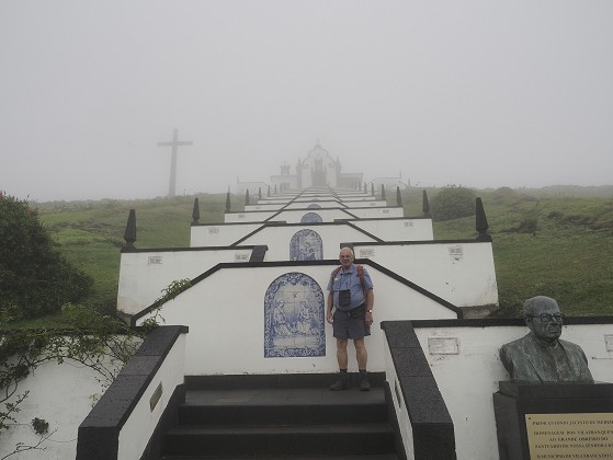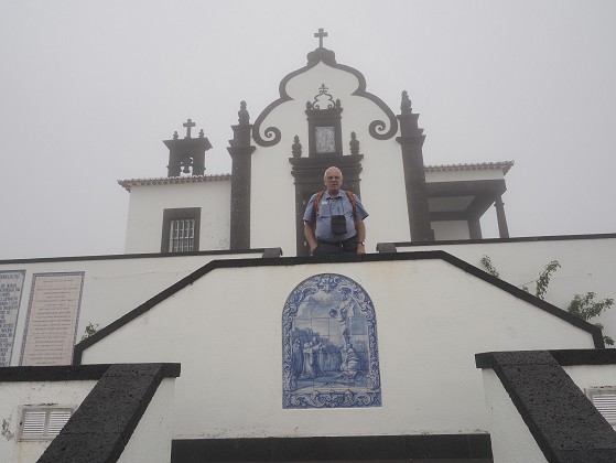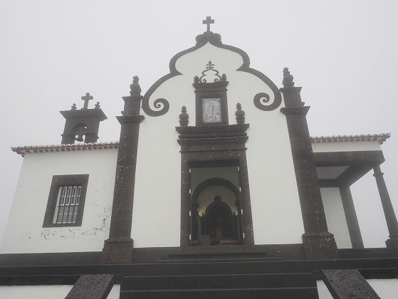 Ons verste oostelijke punt (centraal Sao Miguel) is de Ermida de Nuestra Senhora de la Paz, kapel onze-lieve-vrouw van de vrede, dat gelegen is in de bergen (en vandaag in de mist) boven Vila Franca do Campo. De gps weet blijkbaar niet goed hoe er te komen, er zijn voldoende wegwijzers, we geraken er. De weg er heen is smal, vrij steil en deels in een donker bos. Deze weg leidt enkel tot de kluizenaarskapel, veel Azorianen komen naar dit ‘heiligdom’, sommigen zelfs te voet, voor hen is het een bedevaartsoord.