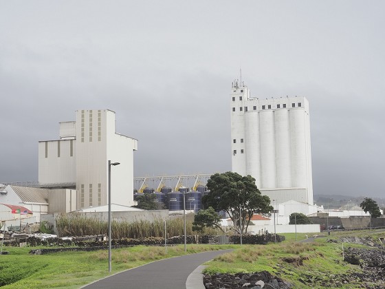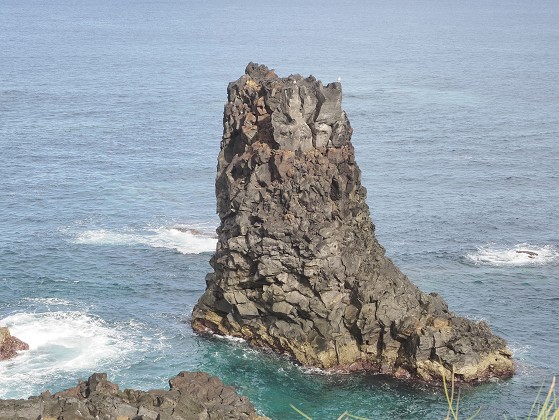 De rots van Sao Roque, en verder de voederfabriek van Lagoa