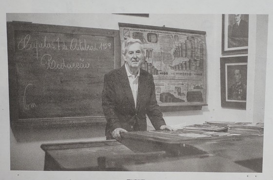 een krantenknipsel waar de man nog als schoolmeester te zien is